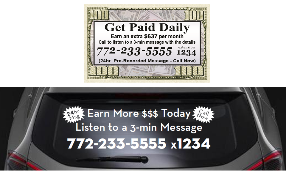 - Handing it to some one you meet and say something like "If you know someone looking to make some extra money have them call to listen to a short message"